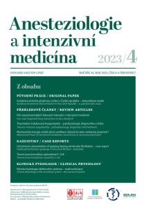 Vydavatel získává otištěním příspěvku výlučné nakladatelské právo k jeho užití. Vydavatel nenese odpovědnost za údaje a názory autorů jednotlivých článků či inzerátů. Jakákoli reprodukce obsahu je povolena pouze s přímým souhlasem redakce a písemným souhlasem vlastníka autorských práv. Redakce si vyhrazuje právo příspěvky krátit či stylisticky upravovat. Na otištění rukopisu není právní nárok. Impaktováno v Emerging Sources Citation Index. Indexováno v EMBASE, Excerpta Medica, Scopus, Emerging Sources Citation Index. Excerpováno v Bibliographia medica čechoslovaca, EBSCO – ACADEMIC SEARCH COMPLETE. REDAKČNÍ RADA / EDITORIAL BOARD VEDOUCÍ REDAKTOR / EDITOR-IN-CHIEF doc. MUDr. Málek Jiří, CSc. ZÁSTUPCI VEDOUCÍHO REDAKTORA / ASSOCIATE EDITORS prof. MUDr. Černý Vladimír, Ph.D., FCCM, FESAIC prof. MUDr. Beneš Jan, Ph.D. EMERITNÍ VEDOUCÍ REDAKTOŘI / EMERITE EDITORS-IN-CHIEF MUDr. Herold Ivan, CSc. prof. MUDr. Adamus Milan, Ph.D., MBA REDAKTOŘI / EDITORS doc. MUDr. Astapenko David, Ph.D., MBA doc. MUDr. Kosinová Martina, Ph.D. EXTERNÍ PORADNÍ SBOR / ADVISORY BOARD prof. MUDr. Cvachovec Karel, CSc., MBA prof. MUDr. Černý Vladimír, Ph.D., FCCM, FESAIC doc. MUDr. Drábková Jarmila, CSc. prof. MUDr. Duška František, Ph.D., AFICM, EDIC prof. MUDr. Matějovič Martin, Ph.D. prof. MUDr. Šrámek Vladimír, Ph.D., EDIC MUDr. Truhlář Anatolij, Ph.D., FERC doc. MUDr. Záhorec Roman, CSc. EDITOŘI SEKCÍ / EDITORS OF THE SECTIONS Intenzivní medicína prof. MUDr. Beneš Jan, Ph.D. doc. MUDr. Balík Martin, Ph.D., EDIC doc. MUDr. Dostál Pavel, Ph.D., MBA doc. MUDr. Máca Jan, Ph.D. MUDr. Stibor Bronislav Algeziologie doc. MUDr. Málek Jiří, CSc. doc. MUDr. Gabrhelík Tomáš, Ph.D. MUDr. Lejčko Jan prof. MUDr. Ševčík Pavel, CSc. Urgentní medicína doc. MUDr. Škulec Roman, Ph.D. MUDr. Kubalová Jana MUDr. Truhlář Anatolij, Ph.D., FERC Anesteziologie a perioperační medicína prof. MUDr. Černý Vladimír, Ph.D., FCCM, FESAIC doc. MUDr. Bláha Jan, Ph.D., MHA, LL.M. prof. MUDr. Čundrle Ivan, Ph.D. MUDr. Mach Dušan MUDr. Peter Merjavý, PhD., EDRA, CETC prof. MUDr. Michálek Pavel, Ph.D., DESA, MSc. MUDr. Nalos Daniel prof. MUDr. Štourač Petr, Ph.D., MBA, FESAIC doc. MUDr. Vymazal Tomáš, Ph.D., MHA Nezařazené příspěvky/Jiné prof. MUDr. Černý Vladimír, Ph.D., FCCM, FESAIC doc. MUDr. Astapenko David, Ph.D., MBA MUDr. Černá Pařízková Renata, Ph.D., LL.M. doc. MUDr. Kosinová Martina, Ph.D. Anesteziologie a intenzivní medicína 2023 / 4 Rok 2023; Ročník/volume 34 Číslo/number 4 (prosinec) Vychází: 5× ročně ISSN 1805-4412 (on-line) Evidováno u Ministerstva kultury ČR pod č. j. E 6101 Cit. zkratka: Anest intenziv Med. Webová stránka časopisu včetně archivu www.aimjournal.cz Vydavatel: Česka lékařská společnost J. E. Purkyně, o. s. Sokolská 31, 120 26 Praha 2, IČ: 00444359 Nakladatel: Solen, s. r. o., www.solen.cz Lazecká 297/51, 779 00 Olomouc, IČ: 25553933 Odpovědná redaktorka: Mgr. Helena Zedníčková e-mail: zednickova@solen.cz / tel.: 778 976 986 Grafická úprava, sazba: DTP Solen, Mgr. Tereza Krejčí Zasílání rukopisů: Zasílejte prostřednictvím redakčního systému ACTAVIA na webových stránkách www.aimjournal.cz. Předplatné: Pro ČR i SR zajišťuje: Solen, s. r. o., Lazecká 297/51, 779 00 Olomouc Tel.: 585 209 206, e-mail: predplatne@solen.cz Předplatné objednávejte na emailu predplatne@solen.cz, ve kterém uveďte jméno a příjmení, fakturační údaje a mailovou adresu, na kterou má být časopis zasílán. Cena pro ČR: předplatné na rok 2024 500 Kč, jednotlivé číslo 110 Kč Cena pro SR: předplatné na rok 2024 25 €, jednotlivé číslo 6 € Časopis je vydáván s finanční podporou MZ ČR.