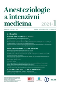 Impaktováno v Emerging Sources Citation Index. Indexováno v EMBASE, Excerpta Medica, Scopus, Emerging Sources Citation Index. Excerpováno v Bibliographia medica čechoslovaca, EBSCO – ACADEMIC SEARCH COMPLETE. Z obsahu PŮVODNÍ PRÁCE / ORIGINAL PAPERS Analýza designu JIP: Opravdu kráčíme vpřed? ICU design analysis: Are we really moving forward? Stanovenie korelácie medzi ultrasonograficky získanými indexami krčných ciev a centrálnym venóznym tlakom u kriticky chorých detských pacientov Determination of the correlation between ultrasonographically obtained indices of cervical vessels and central venous pressure in critically ill pediatric patients PŘEHLEDOVÉ ČLÁNKY / REVIEW ARTICLES Moderní bezkrevní klinické postupy osvědčené v praxi Advanced bloodless clinical procedures proven in practice Výměníky tepla a vlhkosti v intenzivní péči: výhody a rizika jejich používání u mechanicky ventilovaných kriticky nemocných Heat and moisture exchangers in intensive care: benefits and risks of their use in mechanically ventilated critically ill patients Vizita na JIP – klinické review ICU rounds – review Orální hygiena jako klíčová součást balíčku péče v prevenci ventilátorové pneumonie: shrnutí a kritická analýza doporučených postupů v r. 2023 Oral hygiene as a key component of ventilator‑associated pneumonia prevention bundle: a summary and critical appraisal of guidelines and recommended practices in 2023 KLINICKÁ FYZIOLOGIE / CLINICAL PHYSIOLOGY Klinická fyziologie oběhového systému – mikrocirkulace Clinical physiology of the circulatory system – the microcirculation Anesteziologie a intenzivní medicína ISSN 1805-4412 (ON-LINE) ROČNÍK 35, ROK 2024, ČÍSLO 1 (BŘEZEN) 2024 / 1